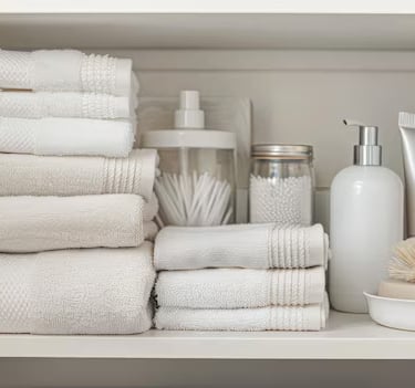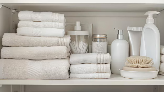 Close-up image of hotel-standard cleaning products lined up neatly on a shelf in a bright, airy short-stay property.